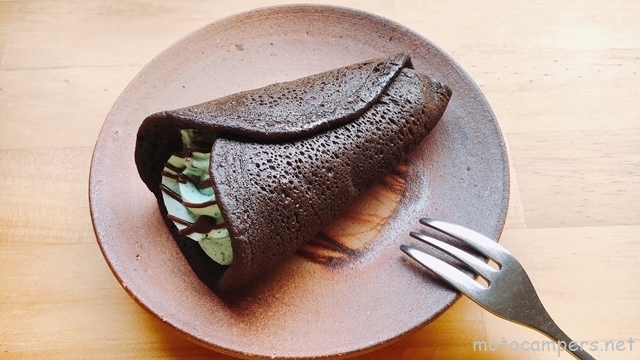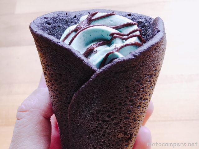 若草色が美しい抹茶や、密やかに愁いを帯びた黒みつが純日本ってとこなら、チョコミント×どら焼き生地の“どらソフトチョコミント”は、新感覚・和洋折衷なクレープですね~