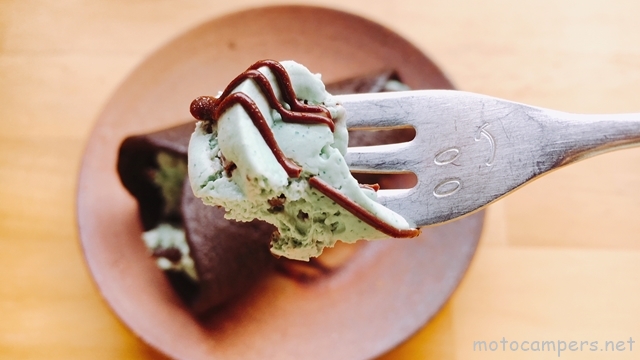 それではさっそく、この目の覚めるように清々しいミントホイップとしっかりとのせられたチョココーチングをいっしょにいただきましょう。