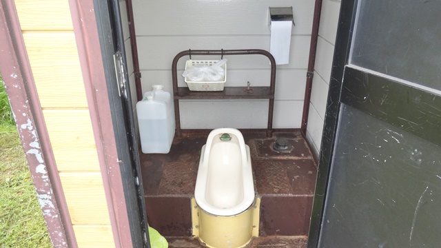 工事現場とかにあるような仮設トイレ風ですが、けっこうしっかりした簡易水洗式トイレなんですよ、これ。