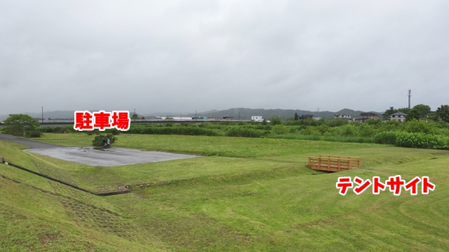堤防上を通る道路から河川敷に下りたところが駐車場。