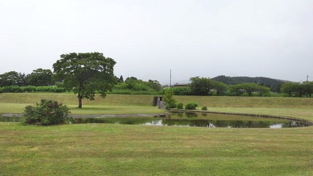 周囲には、アジサイなどの花や木が植えられていて、穏やかな雰囲気。