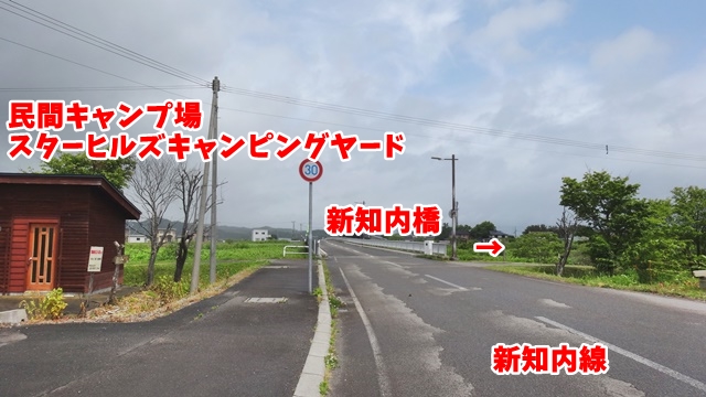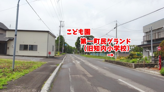 こども園と第一町民グランド(旧知内小学校)の手前の細い道(新知内線)を北上します。
