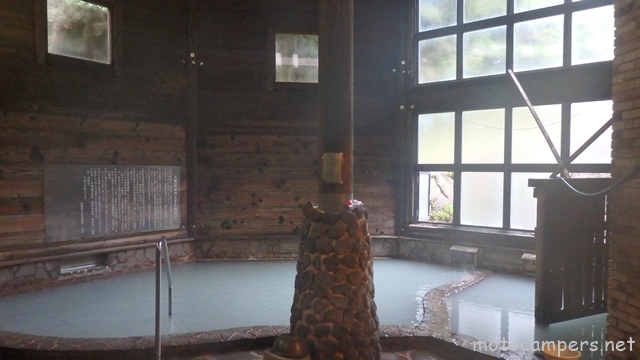 このあたりの温泉は、単純硫黄泉(硫化水素型)の弱酸性で、いかにも温泉らしい乳白色のにごり湯です。